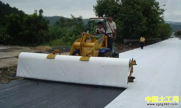 可將瀝青浸漬土工布改成噴灑瀝青結(jié)合油,將土工布牢固地滾壓在上面,再噴一薄層瀝青增加對(duì)面層的粘合度,提高防水性。若使用攤鋪機(jī)鋪設(shè)瀝青混凝土面層時(shí),可不噴面層瀝青,只在底面加大瀝青用量,控制在1000g/m2左右。經(jīng)碾壓后,瀝青會(huì)通過其孔隙透過土工布,反滲到面層。形成一道密封的防水層,同時(shí)還起到加筋作用。