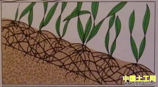使用三維土工網(wǎng)墊護(hù)坡長(zhǎng)出來(lái)的草,情況迥然不同。首先,采用了無(wú)紡?fù)凉げ技咏钔猎鰪?qiáng)了邊坡土體的抗剪強(qiáng)度,保證了在激流沖擊下邊坡的整體穩(wěn)定性。然后在無(wú)紡?fù)凉げ技咏钔疗旅嫔箱佋O(shè)了專(zhuān)為植草用的三維土工網(wǎng)墊,而且用帶有倒鉤的塑料錨固釘錨固在其下土體中,再在網(wǎng)墊上植草。三維土工網(wǎng)墊是一種三維結(jié)構(gòu)材料, 草根在其中便被牢牢鎖定。特別是不存在上述的自然土坡上的草被各個(gè)擊破的現(xiàn)象,因?yàn)檫@時(shí)草根、網(wǎng)墊與其下的土體已連結(jié)成一個(gè)盤(pán)根錯(cuò)節(jié)的整體, 而且隨著時(shí)間的推移,草的根系會(huì)越來(lái)越發(fā)達(dá),其堅(jiān)實(shí)程度會(huì)進(jìn)一步增強(qiáng)。